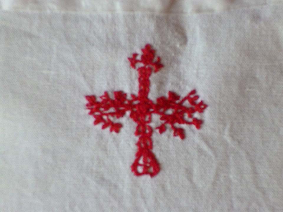 Amices Amices are made of linen. They come in custom sizes. Red crosses are hand embroidered. The ones shown are inspired by bible passages.