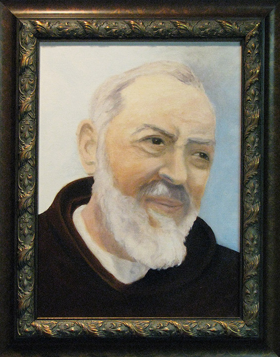 Paintings are available on a commissioned basis. The ones pictured are not for sale they have already been placed. In order of appearance: first is St. Pio of Pietrelcina commissioned by a patron in thanksgiving for great favors received, next is the Assumption of Mary conceived as a donation for a newly built church, third is the Immaculate Heart of Mary surrounded by a crown of thorns with a monstrance behind it. This was inspired by a person who wished to use a similar image in a brochure on the Rosary.
